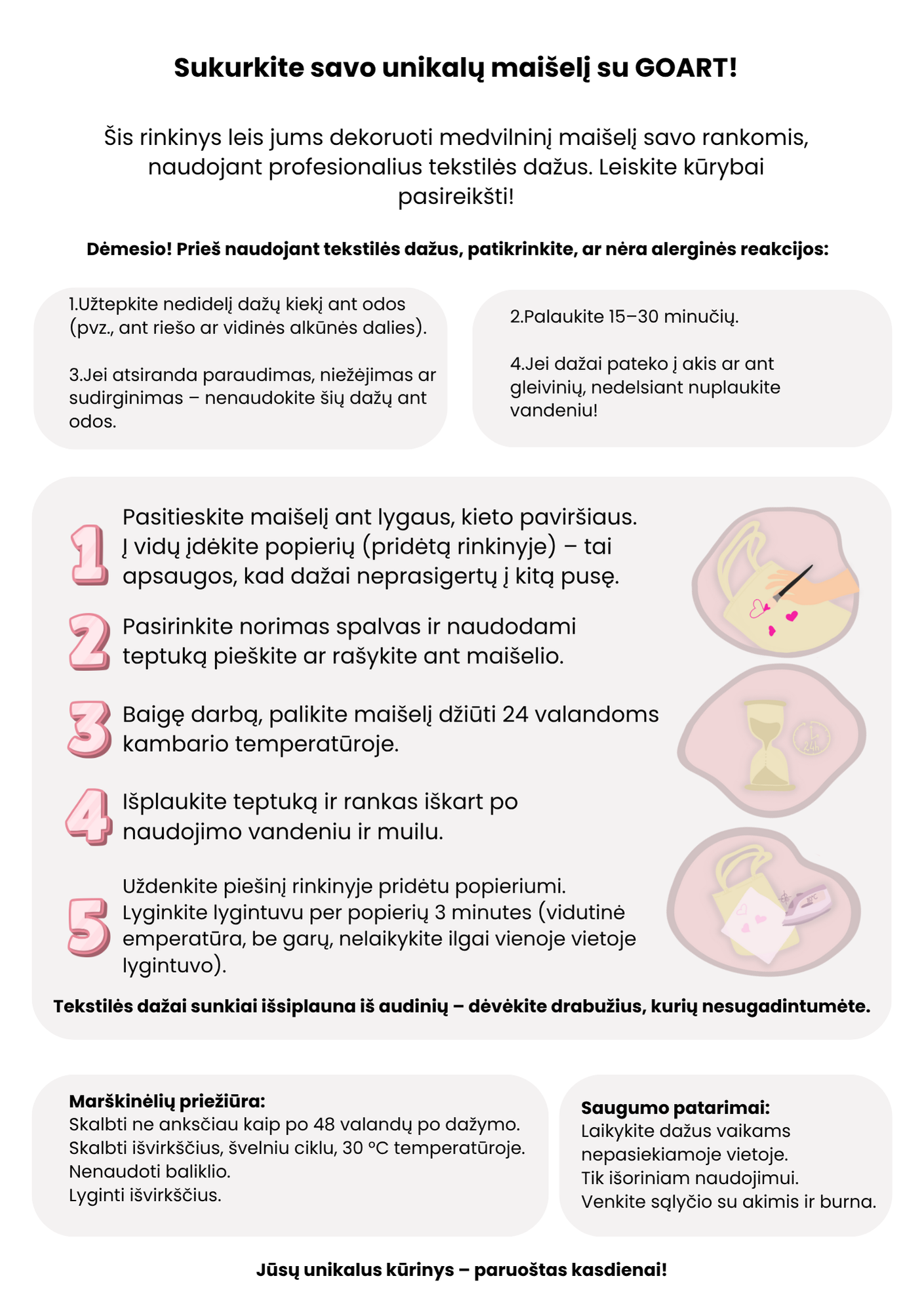DIY maišelio rinkinys kviečiantis į kūrybos nuotykį. Viduje – viskas, ko reikia: nuogas maišelis, tekstiliniai dažai, teptukas, popierius maišelio užbaigimui, instrukcija. Belieka išlaisvinti vaizduotę ir džiaugtis unikaliu aksesuaru.