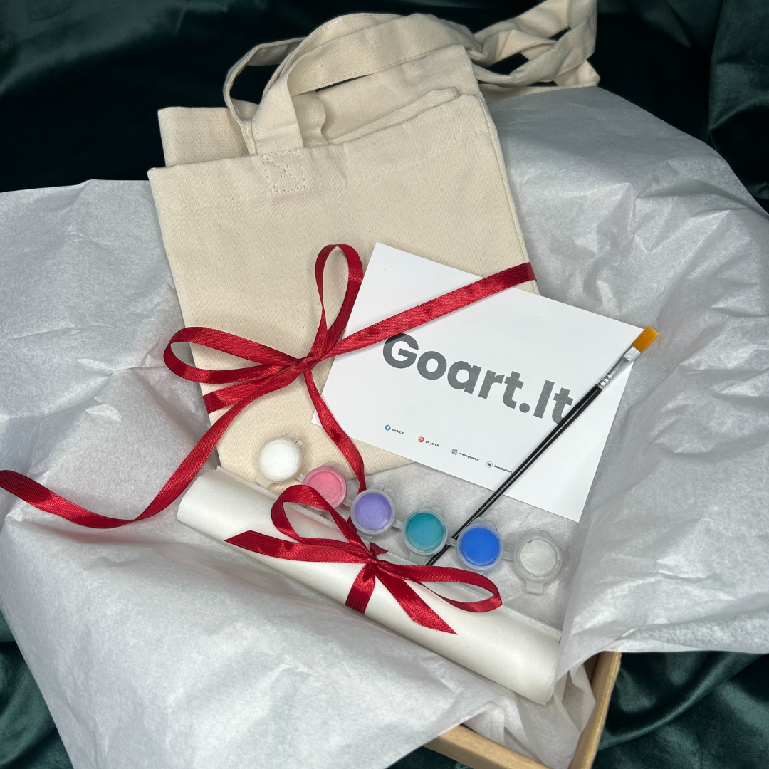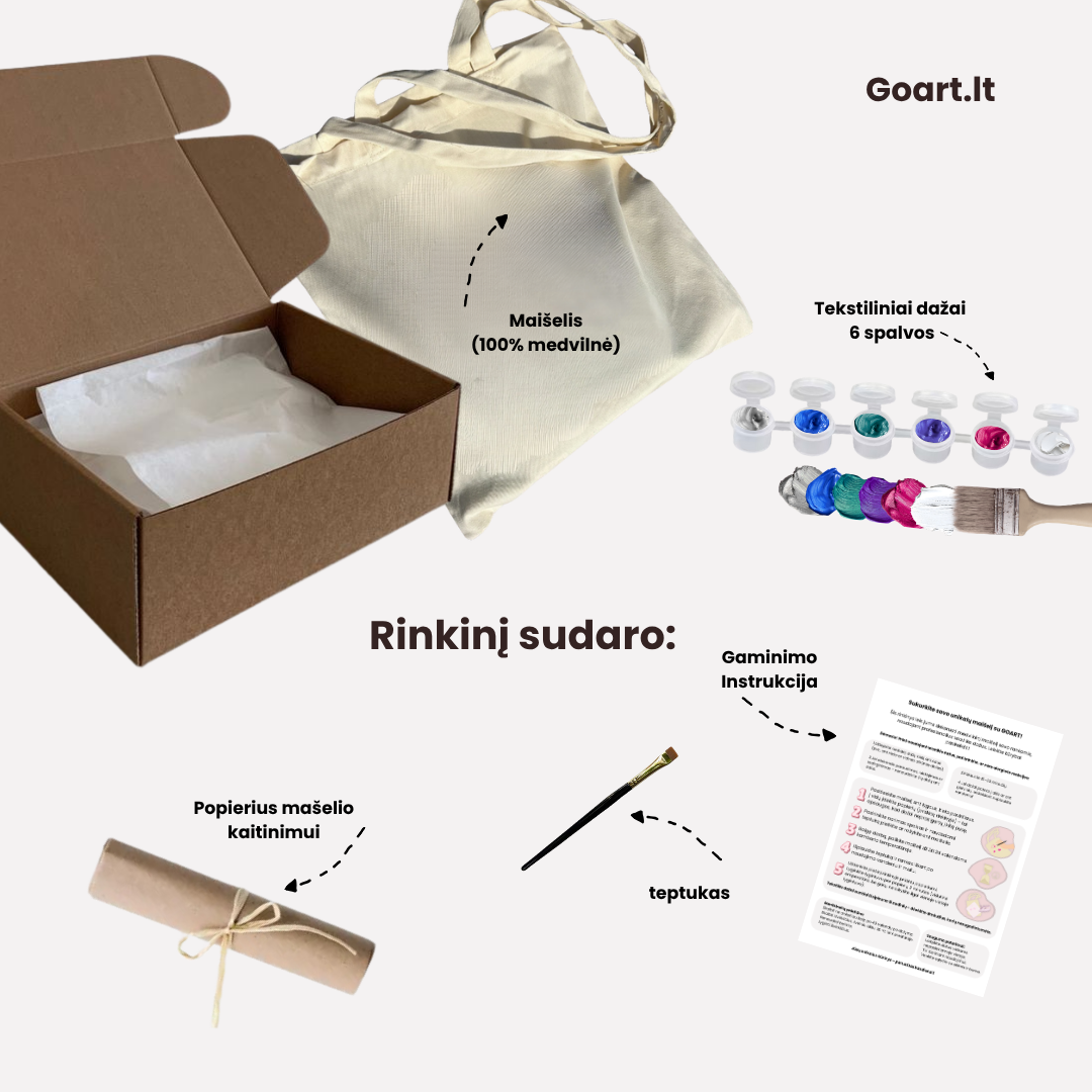 DIY maišelio rinkinys kviečiantis į kūrybos nuotykį. Viduje – viskas, ko reikia: nuogas maišelis, tekstiliniai dažai, teptukas, popierius maišelio užbaigimui, instrukcija. Belieka išlaisvinti vaizduotę ir džiaugtis unikaliu aksesuaru.